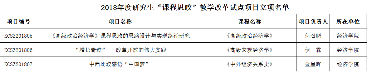 近日,学校研究生院公布了2018年度研究生“课程思政”教学改革试点项目。万象城官网何召鹏老师申报的“《高级政治经济学》课程思政的思路设计与实现路径研究”、伏霖老师申报的“‘增长奇迹’---改革开放的伟大实践”、金星晔老师申报的“中西比较感悟‘中国梦’”获准立项。