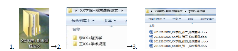 课程论文电子版请以学院为单位,于2019年3月4日16:00前提交至研究生院培养办公室。格式要求如下:1.以“学院名称+期末课程论文”命名文件夹;2.每门课程论文以“授课教师姓名+课程名称”命名文件夹;3.每篇论文以“学号_学院_姓名_论文题目”命名。 图例: