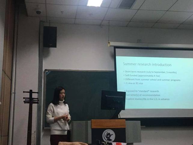 王玮琪同学首先为参会同学介绍了学校海外交换的项目信息及相关的准备材料。并结合自己的准备经验为同学们推荐了参加海外交换项目的合适时机。随后结合各个海外交换目标院校的特点与同学们出国访学的目标,为同学们推荐了不同的交换项目。最后,王玮琪同学结合了自己的托福与GRE备考经验,为同学们的语言考试提出了一些建议。