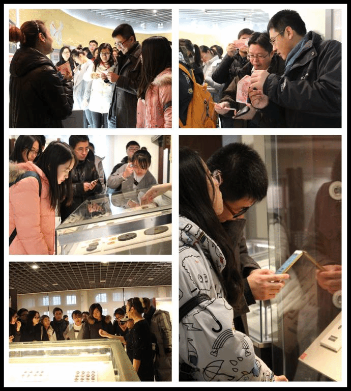 在博物馆工作人员的带领下,同学们依次参观了博物馆一至三层展厅,先秦布币刀币、汉代五铢钱、唐代开元通宝、宋代交子、民国“袁大头”等等久仰其名的货币一一登场,金元宝、摇钱树、“门当户对”等经典形象也纷纷揭开神秘面纱。参观中,兰日旭教授、张琥副教授、伏霖老师三位老师结合经济史知识做实时的讲解,短短的一个小时内,同学们便深刻地体会了一场从先秦到当代,中华上下五千年的社会变迁。在一层展厅中,工作人员还以2005年版100元纸币为例,讲解了现代假币制作的高端技术和最有效辨别假币的几种方法,现场师生纷纷拿出自己手中的人民币试验真伪,气氛热烈。