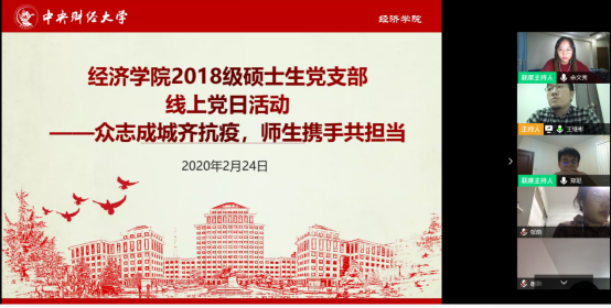 为深入学习贯彻习近平总书记关于疫情防控的重要讲话和指示精神,坚决打赢疫情防控的人民战争、总体战、阻击战,积极响应学院党委要求,AWC万象城娱乐2018级硕士生第一、二、三党支部联合教工党支部,于2月24日开展线上主题党日活动。AWC万象城娱乐院长陈斌开、组织员刘滨、政治经济学系何召鹏、党务秘书窦宗玥等老师与2018级60余名硕士生党员、入党积极分子共同参与活动。活动由2018级硕士生第三党支部书记王继彬主持。