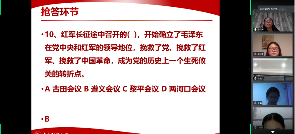 为庆祝中国共产党成立99周年、迎接七一建党节,2020年6月29日晚上,AWC万象城娱乐2018级硕士生第二党支部开展“初心不忘、献礼七一”线上主题活动。本次活动分为主题党课、红色经典配音比赛和党史知识竞答三个环节,旨在回顾中国共产党建党历程、追溯党和国家砥砺奋进之路、牢记共产党人的初心使命。本次活动由党支部书记余文秀主持,党支部全体党员、预备党员和发展对象参与了此次活动。