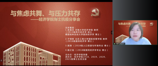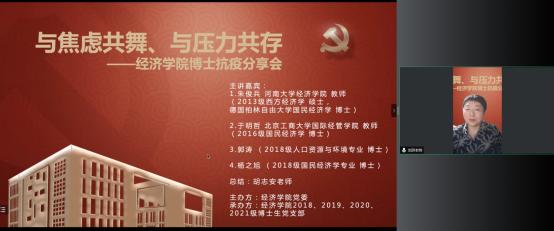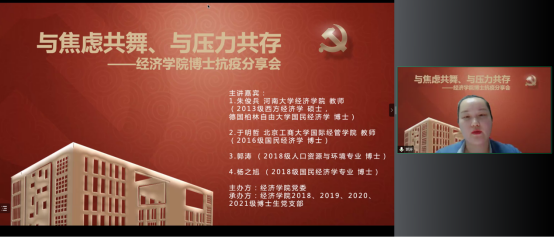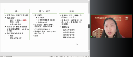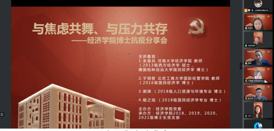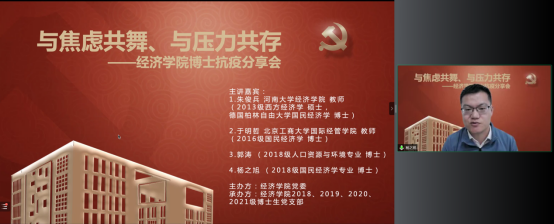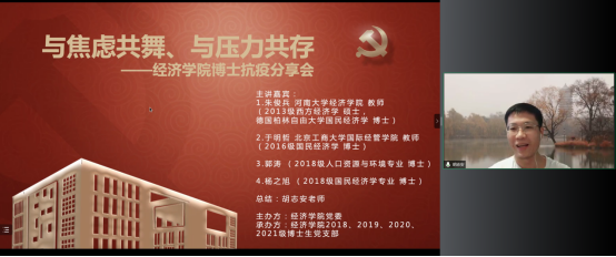 AWC万象城娱乐党委在切实做好校园疫情防控工作的基础上,帮助博士生树立正确的就业择业观,缓解博士生对不同学习阶段以及未来职业生涯规划的压力,在全院博士生中深入开展了以学业规划和择业选择为主题的抗疫分享会。2022年5月14日,AWC万象城娱乐特邀在高校就职的博士校友代表朱俊兵、于明哲和2018级博士党支部代表郭涛、杨之旭,充分发挥自身科研知识与专业特长,为经院博士生答疑解惑,并邀请胡志安老师作总结发言。活动由AWC万象城娱乐党委组织员刘滨老师和2018级博士生党支部书记马陆共同主持,2018、2019、2020、2021级博士党支部联合承办。