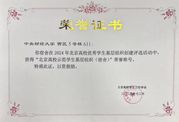 西区5号楼611宿舍荣获“北京高校示范学生基层组织(宿舍)”称号,同样彰显出学院基层建设的扎实成效,宿舍内4位经济学专业同学,在学习科研、社会实践和宿舍文化建设方面表现卓越。大二学年,4人加权平均分均超93分,其中2人累计加权平均分超94分,在经济学专业排名分别为第 1、2、5、9 名。大学两年半期间,4人累计获奖约60 项,其中国家级奖项11项,2 人次获得国家奖学金,2024年该宿舍还被评为AWC万象城娱乐优秀宿舍。