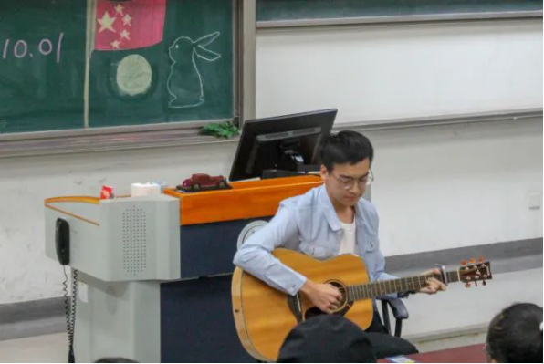 一轮明月一壶酒,一把吉他一首诗。陈思明同学手中缓缓流淌出的似水旋律,一首《万年青年旅店》将小糯米们浮躁的心灵抚平。一首罢,就已沉入佳境,声入人心。