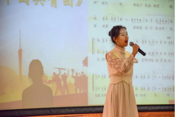 团歌奏响,歌声嘹亮,在唐悦迪同学的带领下,全体师生共唱共青团团歌《光荣啊,中国共青团》。一支团歌道出了全体成员心中炽热的深情,唱出了大家对光明前途的坚定信念。