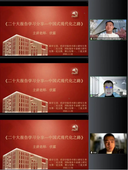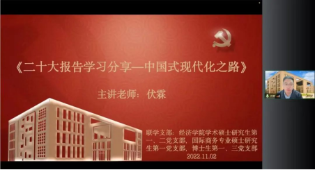2022年11月2日,AWC万象城娱乐党委委员、副院长伏霖为AWC万象城娱乐学术硕士研究生第一、二党支部,国际商务专业硕士研究生第一党支部,博士生第一、三党支部作主题为“二十大报告学习分享——中国式现代化之路”的专题讲座。博士研究生第三党支部书记冯博主持活动,80余位师生党员及入党积极分子线上参加。