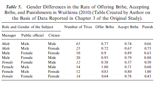 但是这并不一定代表Swamy论文的第一部分的结论:女性对于腐败容忍度更低,是无效的。如Alatas,Cameron, Chaudhuri, Erkal,和Gangadharan (2009)所述,个人的社会角色和在公共领域参与程度决定其接触腐败的程度。因此,当女性和男性在公共领域参与度不同,那么他们对于腐败的态度也会有所不同。另外,有一些国家女性在公共领域参与率较低,当女人属于这种国家时,她们更易受到腐败伤害(因此,对腐败行为的容忍度更低)。这又意味着,在一个真实的腐败情况下,男人和女人的腐败行为没什么不同。