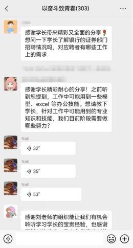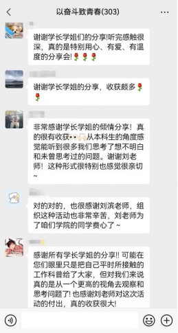 本次教育活动历时一周,微信课堂参与人数突破300人,同学们表示从学长学姐的分享中汲取了智慧、提振了信心、增添了力量,找到了方向,受到同学们的普遍赞誉。