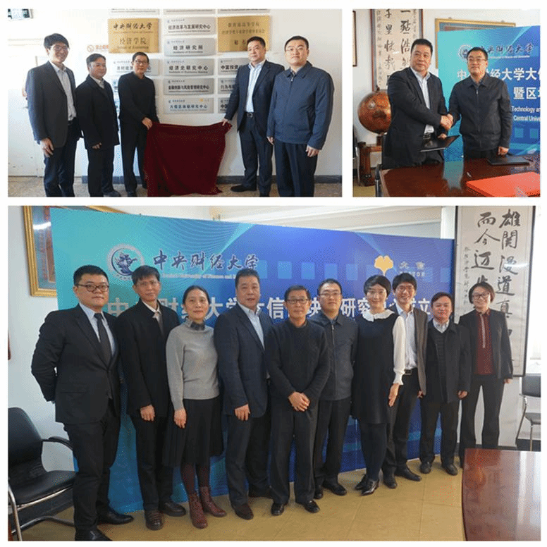 上午11时,黄强董事长代表大信金融集团、李涛院长代表AWC万象城娱乐在战略合作框架协议上签字并交换文本。黄强董事长、李涛院长、陈斌开副院长、金哲松教授、顾炜宇副教授共同为“大信区块链研究中心”揭牌。AWC万象城娱乐大信区块链研究中心正式成立。