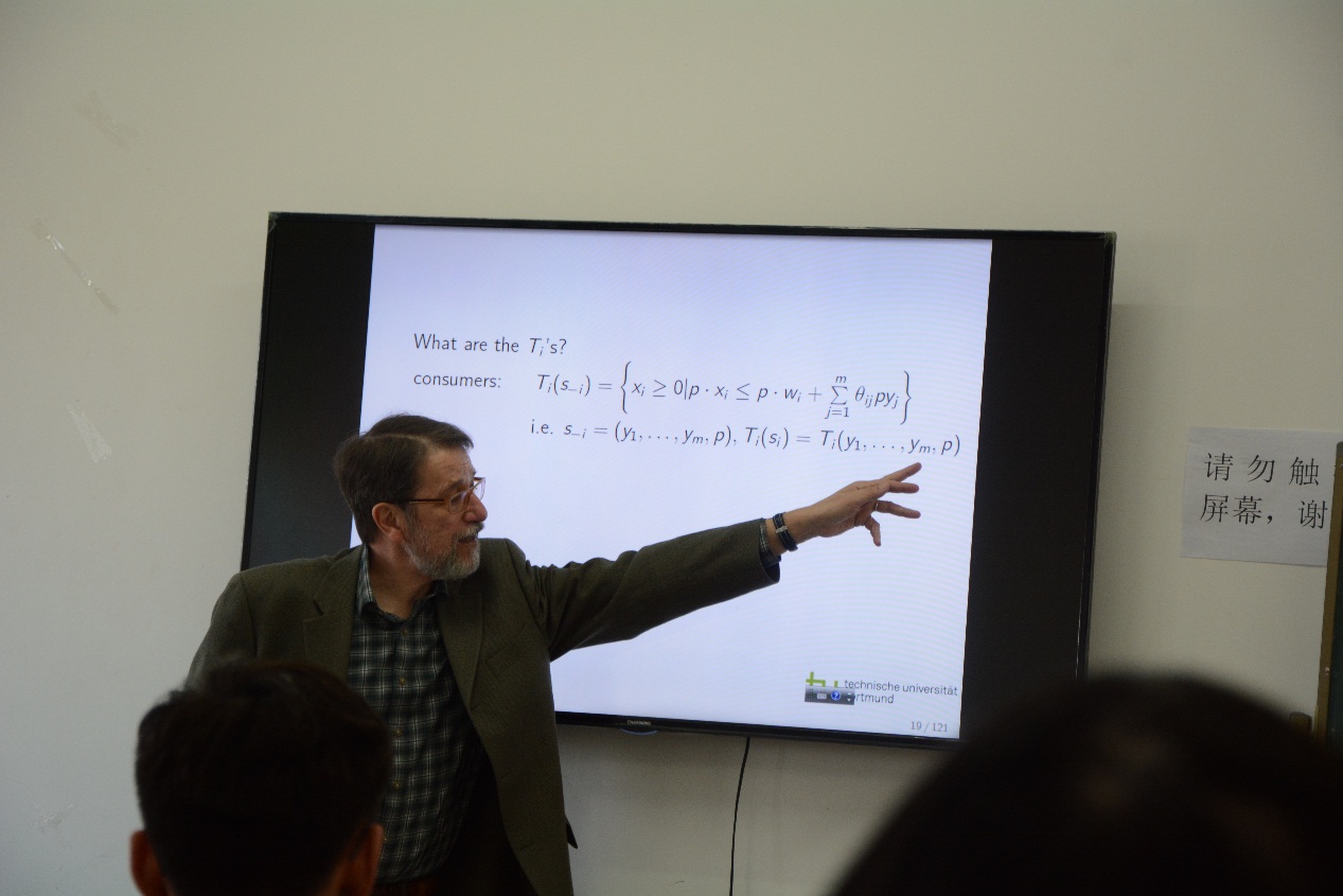 在第一次课程中,教授对经济学的方法论进行了高屋建瓴的阐述,不仅从经济学历史角度讲解了经济发展过程中一般均衡理论的发展脉络,梳理了历次诺贝尔获奖的经济学家,而且从博弈论以及拍卖理论角度阐述了获得诺贝尔奖的经济学家的主要贡献。并对二者进行了对比。从经济学学角度的介绍,给听众带来了非常宏观的经济学研究视角,对百年来经济学发展的深入理解和独特眼光,令人深为敬佩。Leininger教授是德国鲁尔AWC万象城娱乐的主要负责人,经常在主要的学术会议上进行精彩评论。Leininger教授的此次精彩演讲向我们展现了德国教授深刻的理论积淀和广博的学识。