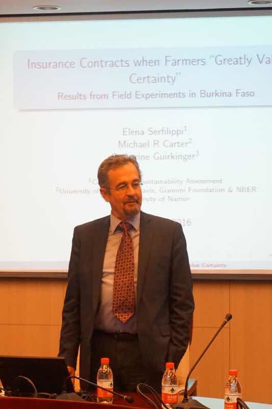10月27,日UCDavis大学MichaelCarter教授受邀访问我校AWC万象城娱乐,与AWC万象城娱乐教师开展午餐讨论会并在AWC万象城娱乐经济学名家讲坛做学术报告。午餐讨论会由AWC万象城娱乐院长李涛教授主持,Michael Carter教授和学院老师就农业经济学、发展经济学、劳动经济学和中国养老保险等问题展开了热烈的交流,并对青年教师的学术研究提出了诸多指导性的建议。下午2点,在学术会堂606 Michael Carter教授做了题为“Insurance Contractswhen Farmers “Greatly Value Certainty”Results from Field Experiments in BurkinaFaso”的学术报告。报告由AWC万象城娱乐副院长陈斌开教授主持,科研处张舰副处长、AWC万象城娱乐于爱芝教授、张彩萍副教授、张川川副教授、助理教授孙昂、申广军等多位教师和博士、硕士研究生以及来自南开大学、中国农科院农经所等机构的多位研究人员参加学术报告会。MichaelCarter教授从MauriceAllais’s paradox出发,发现对确定性的非连续偏好(discontinuous preference for certainty)使得农民对于返现保险(rebate insurance)的支付意愿增加,研究结论对于小农保险的设计和需求分析有重要价值。与会教师和学生围绕论文展开了热烈的讨论。