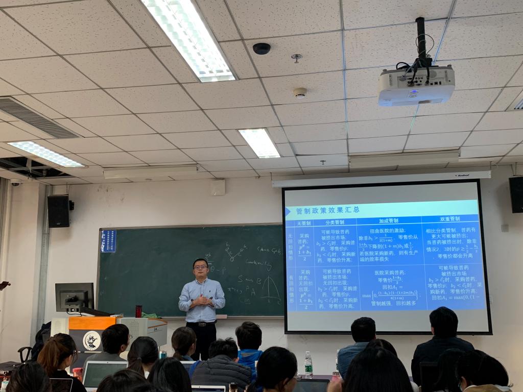 其次,寇宗来老师采用了经典的“制造商—零售商”分析框架,“上游”是竞争性的普药厂商和垄断的新药厂商,“下游”是垄断医院。上游的两种厂商分别定价,下游的医院决定采购哪家的药品,再转卖给患者。同时引入加成规制和回扣条件。寇宗来老师分别考虑了四种情况:无管制;仅有加成规制;仅有分类规制;有双重规制,并进行了分析。分析表明,无折扣情形下,与无规制基准相比,单纯的加成规制可以提高社会福利;但双重规制则可能降低社会福利。有折扣情形下,与无规制基准相比,规制不会导致社会福利提高,规制手段越多,社会福利越低。考虑到折扣的可能性,零加成规制不一定能够达到预期效果;而且正是各种规制政策导致了药品回扣。讲座过程中,寇宗来教授与参与本次讲座的教师、同学们进行了热烈的互动交流,并在讲座结束前,与教师、同学分享了自己的学习和研究的经验,在场师生都表示受益匪浅。