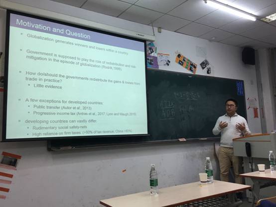 其次,戴觅副教授讲解了本文的研究方法及数据:使用了1998-2007年中国工业企业数据库资料、市县财政统计资料以及城市住户调查资料从公司层面、城市层面及家庭层面来研究中国如何缓解加入WTO后,贸易自由化带来的冲击。运用图表分析和回归分析,得到以下结论:第一,从行业和公司层面来看,关税下降大的行业,其增值税和所得税下降的越多,并以增值税和所得税的下降来缓解贸易自由化带来的冲击;第二,从城市层面来看,关税下降对本身有较高增值税和所得税的城市影响越大,关税下降减少了财政自有收入,但对财政支付转移影响不大;第三,从家庭的层面来看财政收入下降对财政支出的影响,发现政府在生产性基础设施建设、教育、医疗保险等民生方面减少了支出,但是社会保障支出变化不明显。同时通过稳健性检验再次证明了中国是以税收政策来缓解贸易自由化带来的冲击,而非社会保障机制。