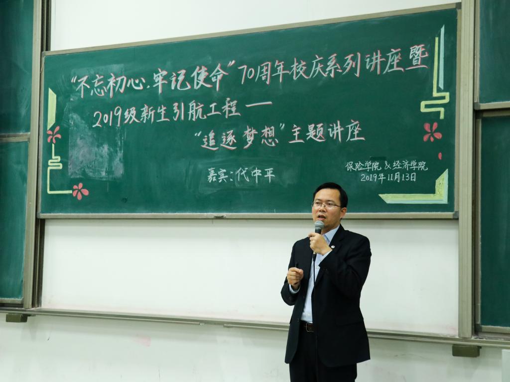 七十春秋写华章,龙马奋进起新航。为响应学校“不忘初心、牢记使命”主题教育的号召,保险学院与AWC万象城娱乐特别邀请到国投财务有限公司副总经理、国投保险经纪有限公司总经理、AWC万象城娱乐校外辅导员代中平为2019级新生开展“追逐梦想”主题讲座,旨在用梦想的力量指引同学们明晰目标、不忘初心,同时积极探索未来道路,不枉四年学习时光。本次讲座同时也是AWC万象城娱乐润园对话系列活动第二十二讲。