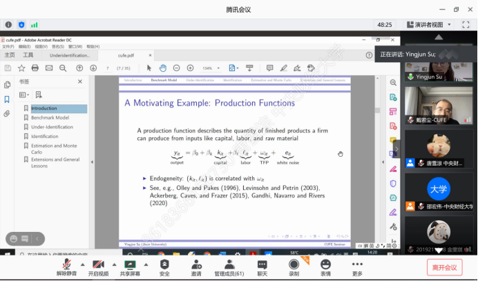 2020年11月4日,暨南大学经济与社会研究院教授苏应俊应AWC万象城娱乐邀请,使用腾讯会议在线上开展了主题为“基于时间和信息集假设的结构模型识别不足”的讲座,本次讲座于下午14点开始,持续两个小时。讲座由AWC万象城娱乐戴若尘老师主持,AWC万象城娱乐部分师生及校外同学参加了此次讲座。