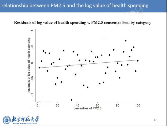 本次讲座中,张欣老师利用武汉市基本医疗保险项目的个人卫生支出数据,估算了所有不同年龄人群因细颗粒物(PM2.5)而发病所致的医疗成本。他们研究发现,无论从短期还是长期来看,PM2.5对医疗支出都有显著影响。为了缓解计量模型中潜在的内生性问题,他们使用逆温作为雾霾的工具变量,工具变量的结果显示,每月PM2.5每减少10μg/m3,卫生支出成本减少2.79%,就医和购买药品数量减少0.70%,这一影响对于男性、幼儿(5岁及以下)和老年人(51岁及以上)的影响更为显著。