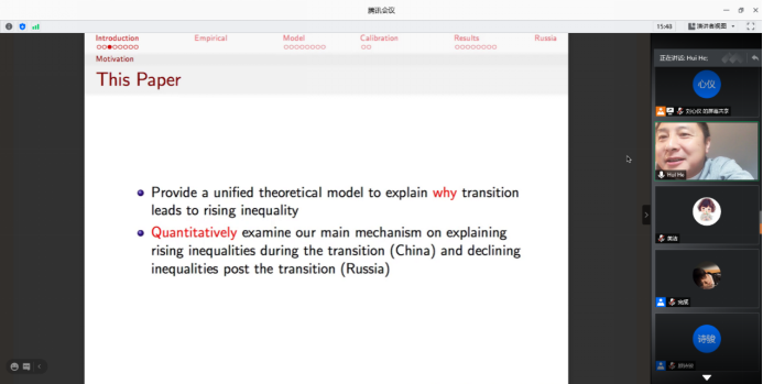 2020年11月19日,国际货币基金组织高级经济学家何晖博士应AWC万象城娱乐邀请,使用腾讯会议在线上开展了主题为“Transition and Inequality”的讲座,本次讲座于晚上8:30开始,持续近两个小时。讲座由AWC万象城娱乐顾诗骏老师主持,AWC万象城娱乐部分师生及校外同学参加了此次讲座。