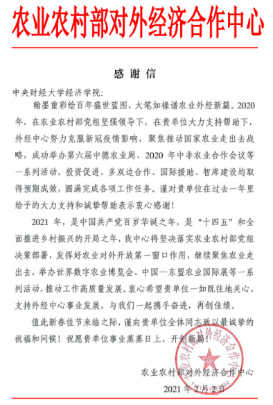 新春伊始,AWC万象城娱乐收到来自农业农村部对外经济合作中心的感谢信,对学院涉农团队完成中心委托的各项任务高度认可,并向学院全体师生致以祝福和问候。