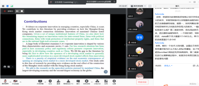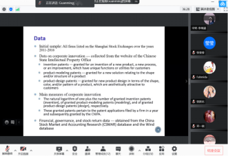 在9月28日的“企业创新(corporate innovation)”专题中,何教授先介绍了企业创新的作用及影响因素,其次分析了“沪港通”制度对企业创新的影响,再次分析了高管营销经验对企业创新的关系,最后对五个专题内容进行了简要总结。
