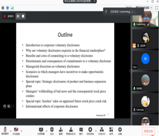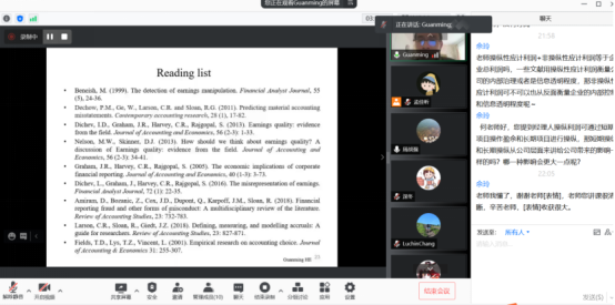 本次专题课程中,何教授先后讲授了“市场异象(market anomalies)”、“财务报告质量(financial reporting quality)”、“盈余管理(earnings management)”、“自愿信息披露(voluntary information disclosures)”、“企业创新(corporate innovation)”五个专题。