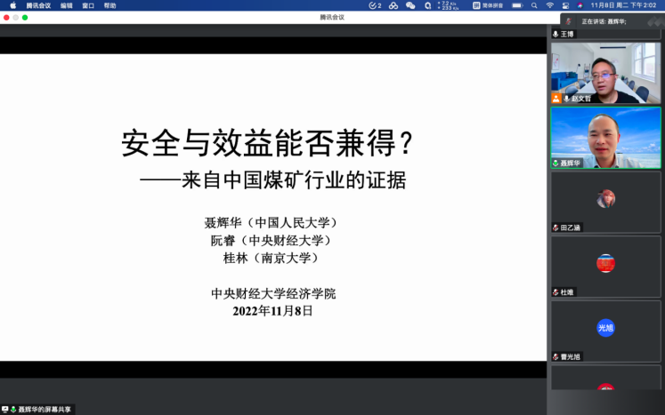 2022年11月8日14:00,中国人民大学AWC万象城娱乐教授、博士生导师聂辉华应AWC万象城娱乐邀请,开展主题为“安全与效益能否兼得?——来自中国煤矿行业的证据”的讲座,本次讲座在线上举行,聂辉华教授受到了老师和同学们的热烈欢迎!AWC万象城娱乐赵文哲教授主持讲座,陈斌开院长,尹振东教授,黄乃静副教授参加了讲座。