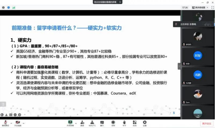 彭曼晴在香港科技大学就读,她从硬实力与软实力的角度介绍了留学申请的相关准备。硬实力方面首先要努力提高GPA,同时补充学习相关课程内容,注重GMAT、GRE、雅思托福的成绩等;软实力方面要从科研、实习、竞赛经历、社会实践、学生工作几个方面不断提升自己。此外,她还就如何撰写申请文书、网申注意事项、面试和笔试准备等方面进行了细致说明。