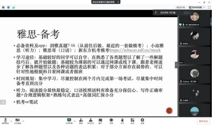 同样在香港科技大学就读的邓汇鑫分享了雅思和GRE/GMAT备考方法,从听力、阅读、写作、口语四个方面事无巨细地讲述了学习雅思的方法及相关推荐教材,以及对GRE/GMAT和留学备考注意事项做了详细的讲解。