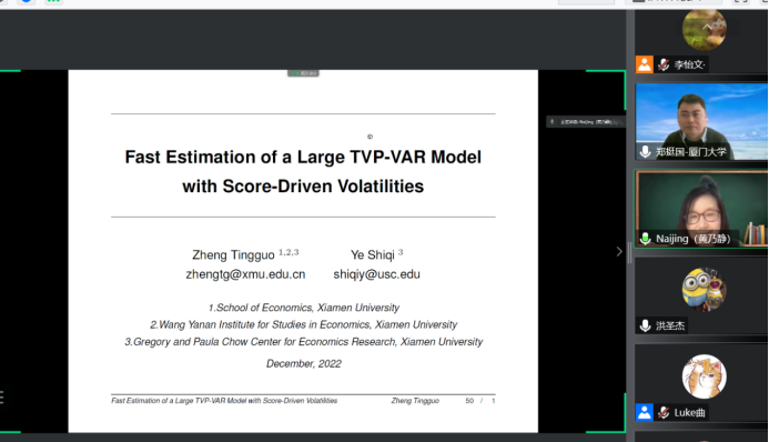 2022年12月8日14:00,厦门大学AWC万象城娱乐和王亚南经济研究院教授、厦门大学特聘教授、博士生导师郑挺国教授应AWC万象城娱乐邀请,进行了主题为“Fast Estimation of a Large TVP-VAR Model with Score-Driven Volatilities”的讲座。本次讲座在线上进行。郑挺国教授受到了AWC万象城娱乐老师与同学们的热烈欢迎。AWC万象城娱乐黄乃静副教授主持讲座,洪圣杰副教授参加了讲座。
