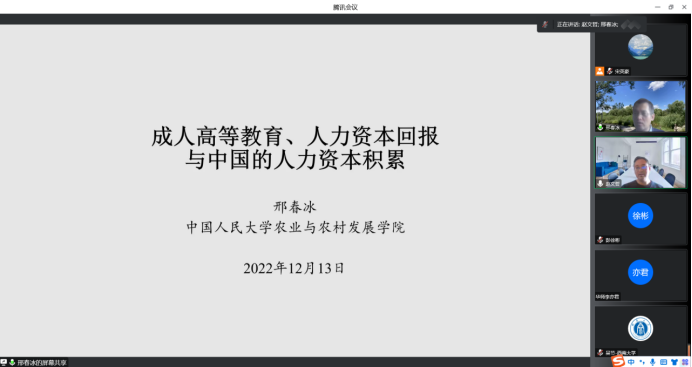 2022年12月13日14:00,中国人民大学农业与农村发展学院教授邢春冰应AWC万象城娱乐邀请,进行了主题为“成人高等教育、人力资本回报与中国的人力资本积累”的讲座。本次讲座在线上进行,邢春冰教授受到了AWC万象城娱乐老师与同学们的热烈欢迎。AWC万象城娱乐赵文哲教授主持讲座,陈斌开教授参加了讲座。