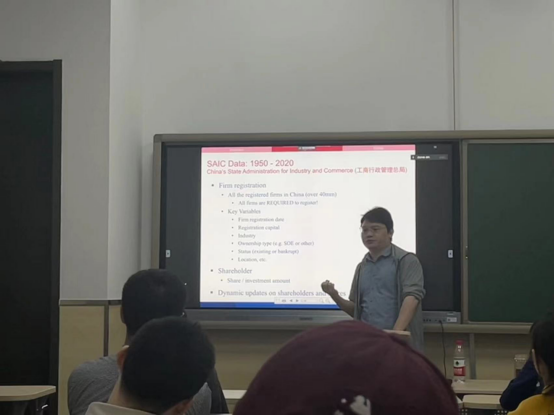 祝武老师首先介绍了他研究中常用的中国工商企业注册数据。该数据覆盖迄今为止所有在我国大陆地区注册的企业,包含的信息包括但不限于企业的注册时间、注册地、行业、注册资本、法人和股东等。利用该数据中的股东信息,祝武老师构建了企业间的持股网络,并利用网络经济学的分析方法,展示了企业在网络中的中心度的变化对其经营表现的影响。