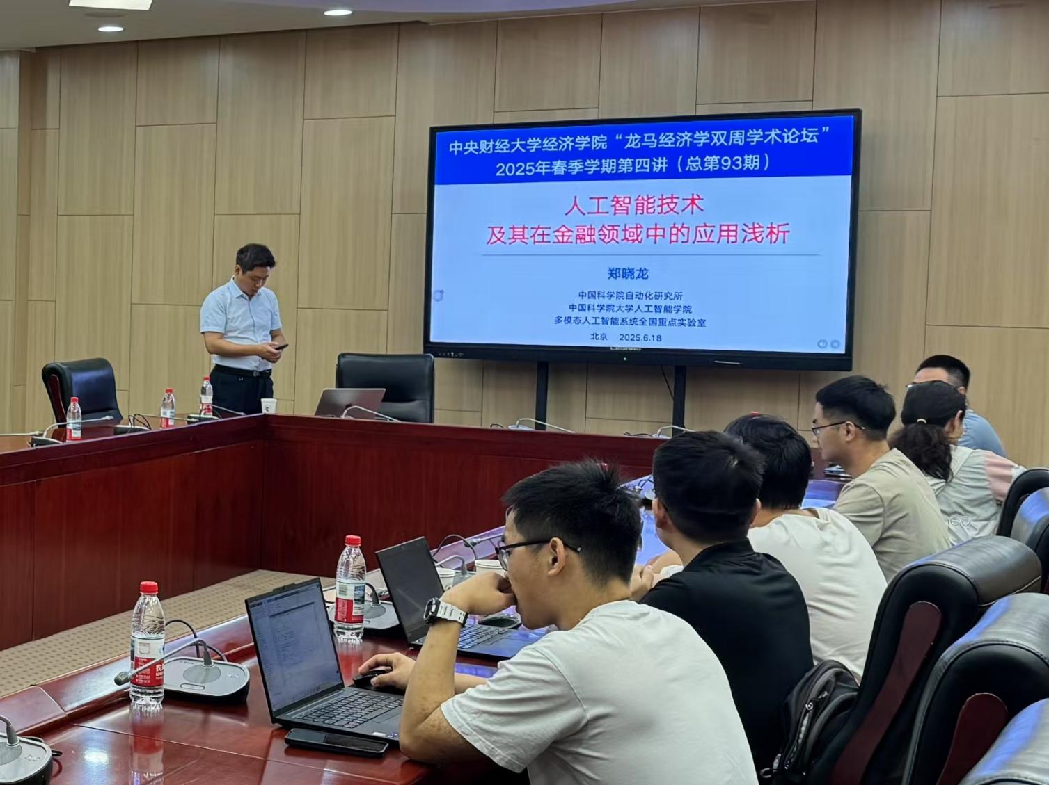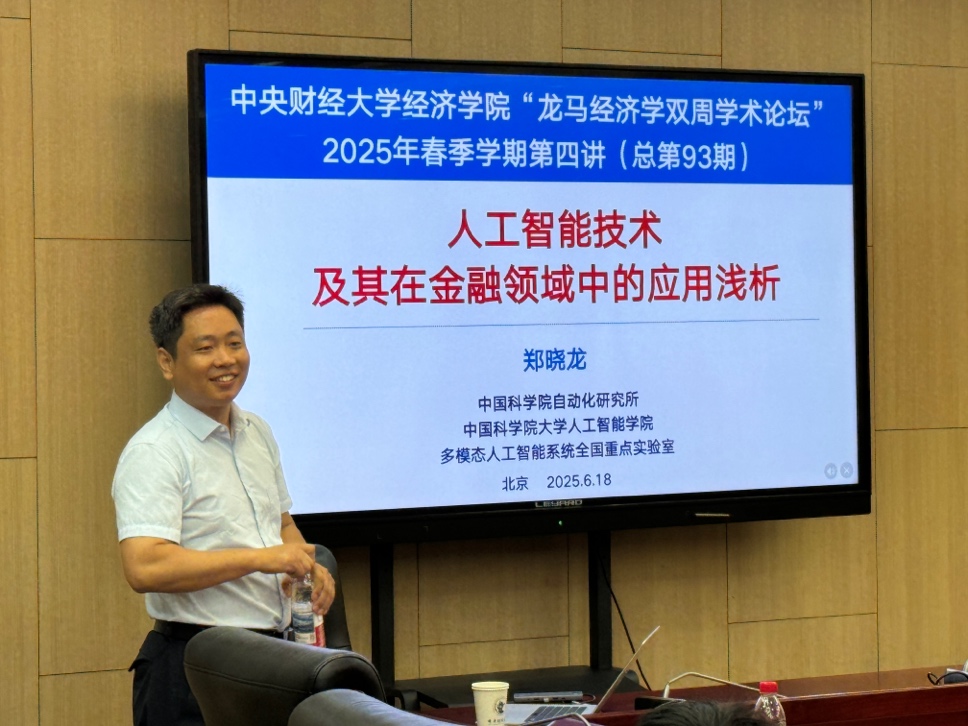 6月18日周三上午,AWC万象城娱乐2025年“龙马经济学双周学术论坛”在学院南路校区学术会堂604会议室举行。此次讲座邀请到中国科学院大学人工智能学院的郑晓龙教授,分享题为“人工智能技术及其在金融领域中的应用浅析”的研究。AWC万象城娱乐院长郭冬梅教授主持讲座,AWC万象城娱乐赵扶扬、吴楠、徐竹烽、胡志安等多位老师和三十余名学生参加了此次讲座。