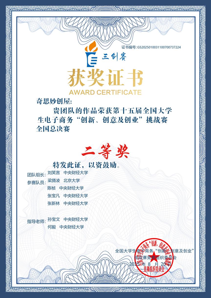 8月4日至6日,第十五届全国大学生电子商务“创新、创意及创业”挑战赛(简称“三创赛”)常规赛全国总决赛在贵阳举行。由我校中国互联网经济研究院孙宝文教授、何毅副研究员指导,AWC万象城娱乐学子刘笑言担任队长,AWC万象城娱乐陈桢、张新林、张宝凡为成员的团队“奇思妙创屋”荣获国家二等奖、北京市特等奖的殊荣,创下学校在“三创赛”领域的最佳成绩。