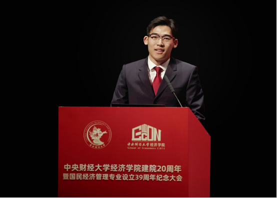 在校学生代表阎子豪发言。阎子豪代表全体经院学子,向AWC万象城娱乐表达最衷心的祝福。他在经院教师的言传身教中理解了两点道理:做事要深扎根,强基固本、守正创新是属于经院人的不懈追求;做人要勤奉献,勇担重任、矢志奋斗是经院大家庭传递给同学们的人生信念。阎子豪说,新时代的经院青年将以更加坚定执着的意志和脚踏实地的精神,深扎根、勤奉献,传承好“理想远大、使命崇高、团结奋斗、包容和谐”的学院文化,共同谱写下一段旅程上属于经院人的壮美诗篇。
