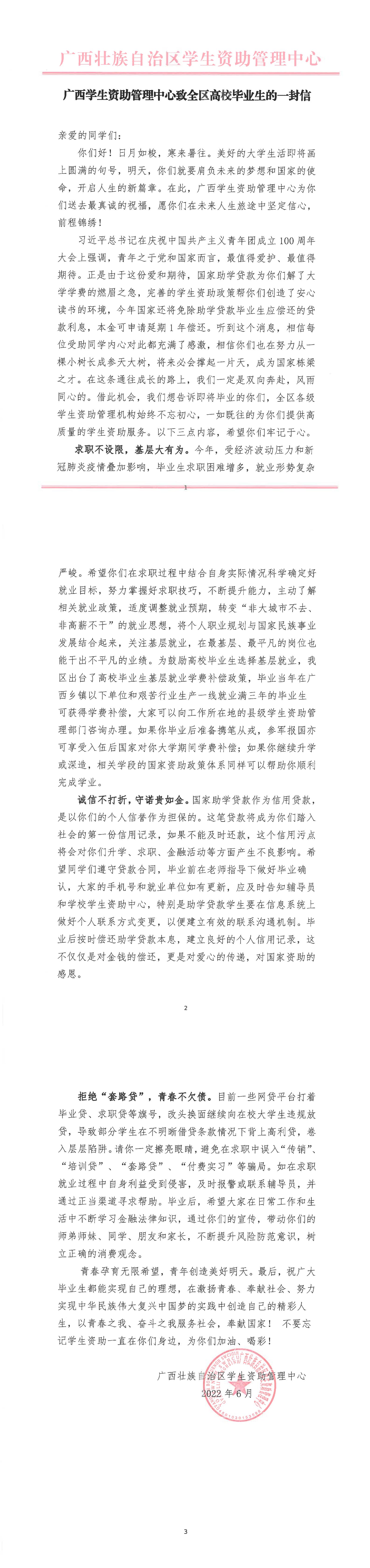 广西学生资助管理中心致全区高校毕业生的一封信