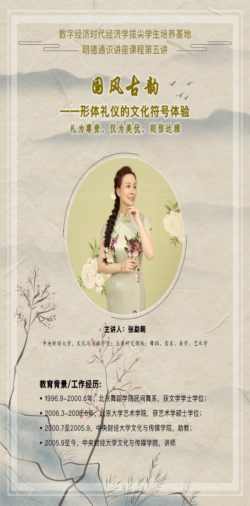 2022年5月25日,基地邀请到了我校文化与传媒学院的张勐萌老师做“国风古韵·文化自信-形体礼仪的文化符号体验”主题讲座。