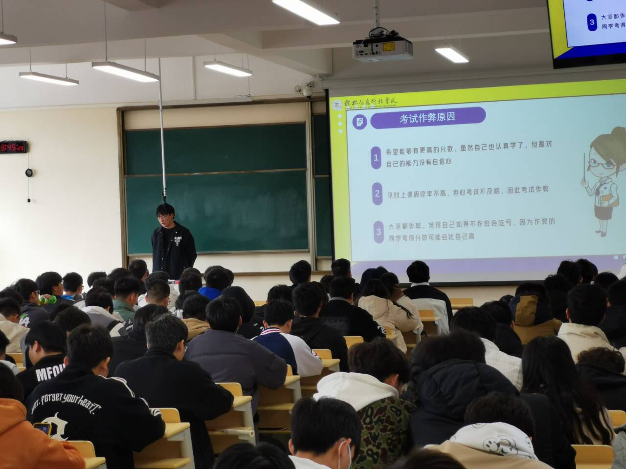 会上,辅导员由诚信的定义出发,分别从考试作弊的原因、考试作弊的后果以及作弊对心理健康的危害等三个方面进行讲解,并结合《学生手册》中的内容向大家强调诚信考试的重要性。最后,辅导员组织同学们阅读《诚信考试承诺书》并在上面签名。