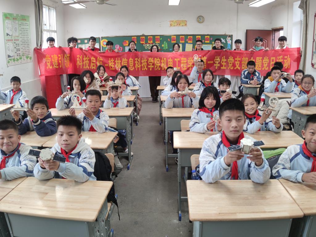 活动伊始,严继玲老师宣读此次活动的内容及意义,紧扣主题“党建引领,科技启航”。桂林市龙门中心校谭凌强副校长对支部党员的到来表示热烈的欢迎及衷心的感谢。接着,机电工程协会和支部党员先后带领小朋友们安全有序的进行了科技作品展览——六爪机器人、流水灯广州塔;现场制作机电工程学院全区青少年科技运动会第一名项目“铁丝陀螺比久”作品;支部党员指导小学生组装手摇发电机、人造卫星模型。小学生们对展示的作品及手工组装制作兴趣盎然,现场气氛热烈活跃。