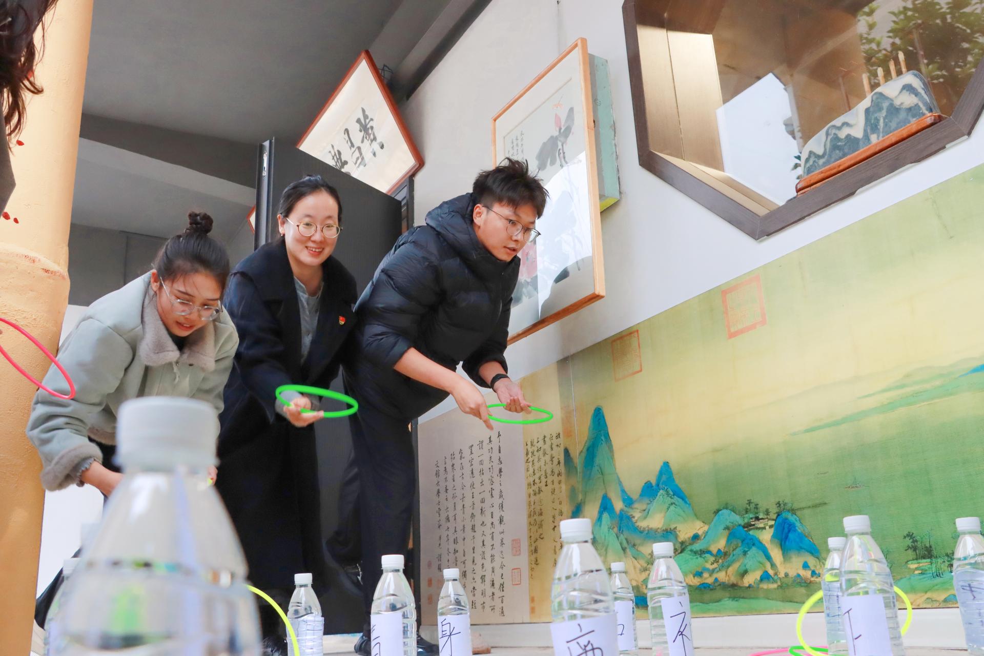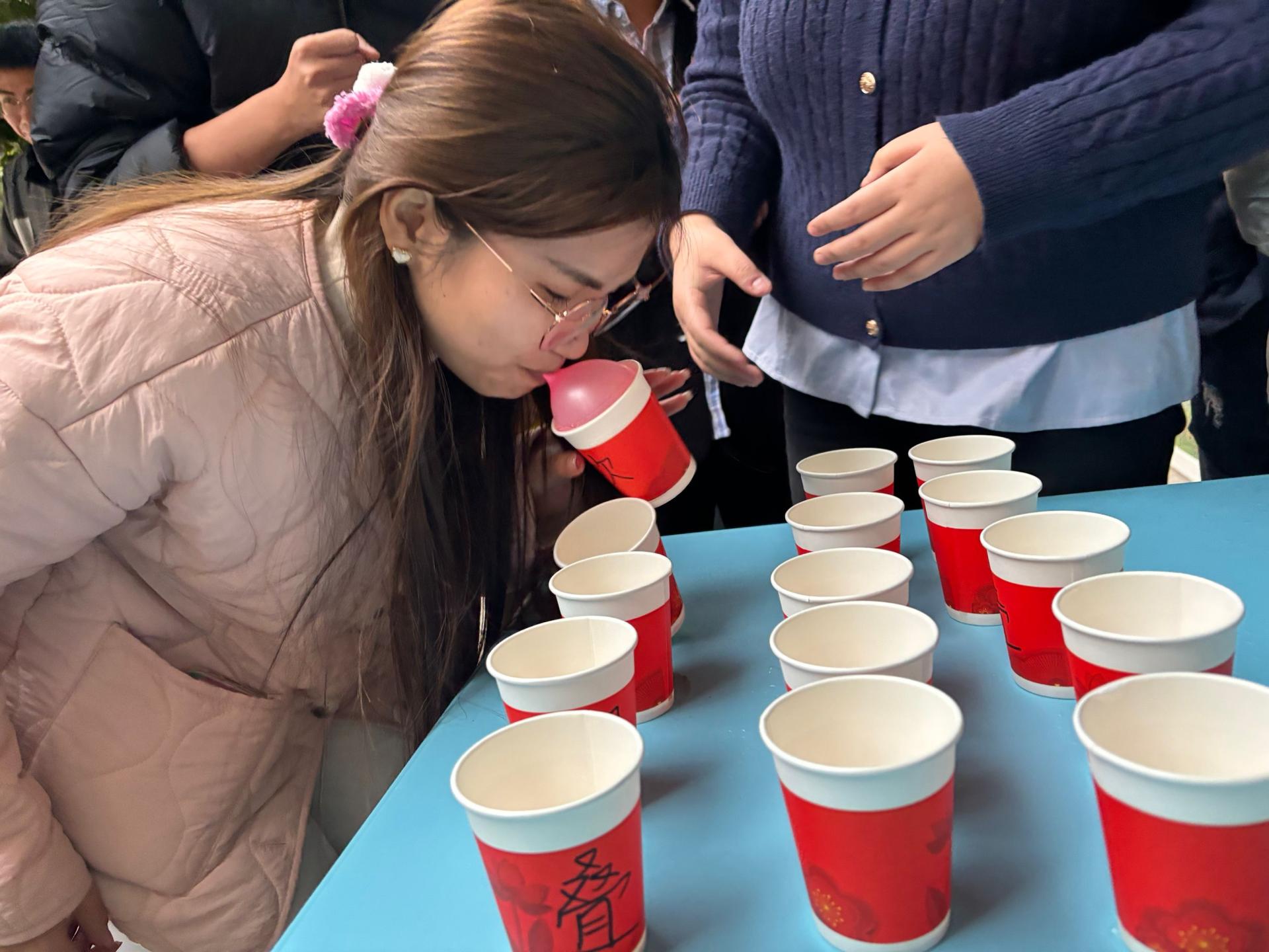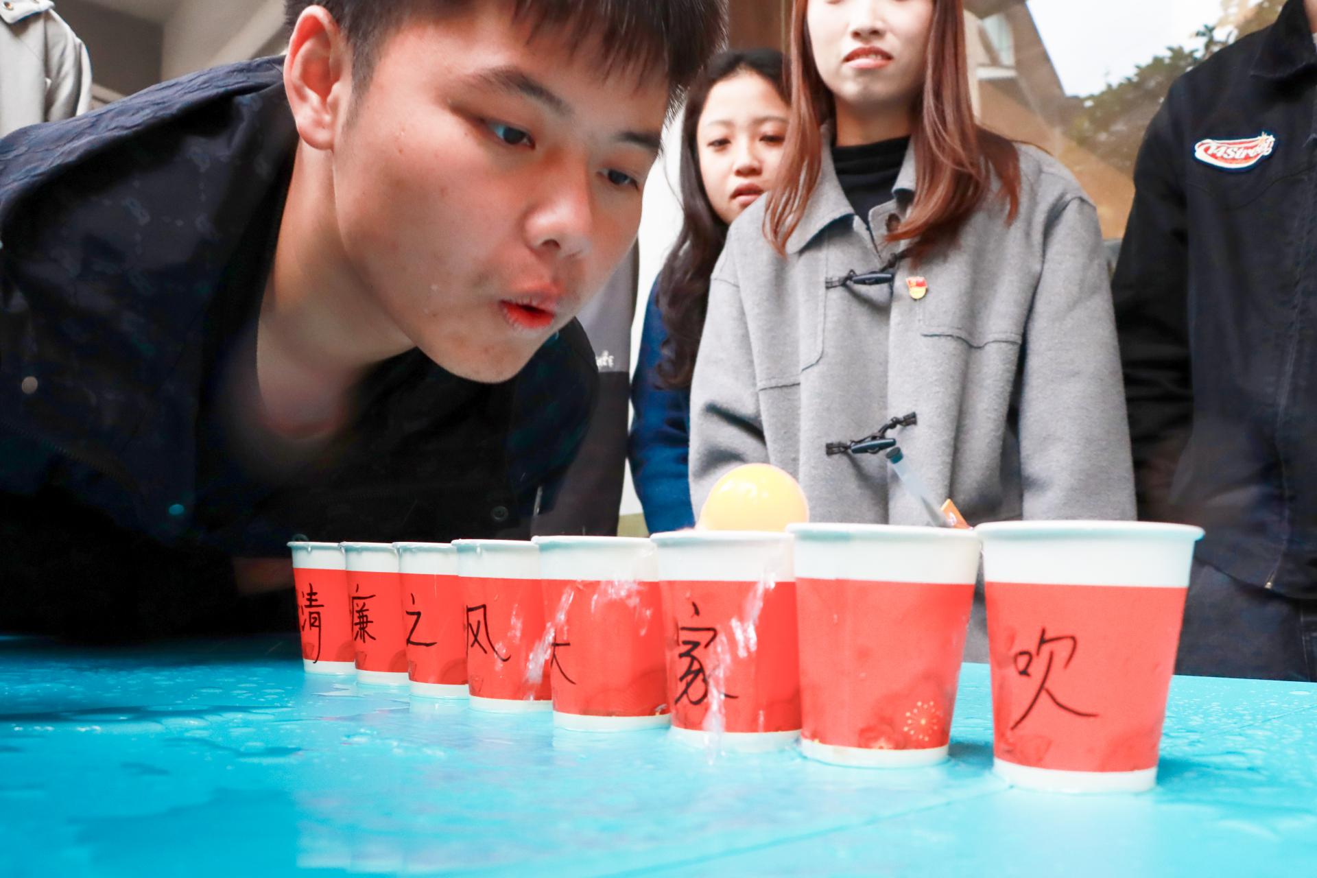 本次活动由三个素质拓展游戏组成,每个游戏都巧妙地融入了廉洁元素,兼具趣味性与教育意义。“清廉之风大家吹”游戏中,各学生党支部组成参赛队伍,每队3名队员齐心协力,对着乒乓球轻轻吹气,让其在装满水的纸杯上顺利前行。乒乓球在纸杯间跳跃滚动,仿佛是清廉之风在传递,现场气氛紧张刺激。“吹廉洁风,叠正气杯”游戏,队员们小心翼翼地将气球放入口中,努力吹胀气球,凭借气球的膨胀力撑起纸杯依次叠放。队员们专注投入的神情和坚持不懈的努力,如同在廉洁道路上坚定前行,无论遇到何种困难都坚守底线、不屈不挠。 “树底线,心向廉”游戏,每队3名队员站在投掷线后,手持圆环,眼神坚定地瞄准前方投向呈矩阵排列的矿泉水瓶,每一次成功套中都伴随着热烈的欢呼声,如同在廉洁之路上共同坚守底线、追求高尚,进一步彰显了廉洁文化中团结一心、积极向上的精神力量。