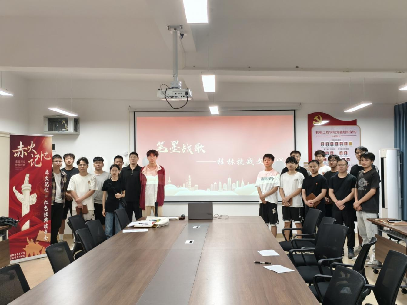 10月14日晚19时,机电工程学院第五学生党支部在正心楼J706教室举办“笔墨战歌——桂林抗战文化城”主题读书会。党支部书记于凌浩主持活动,全体党员参会。此次读书会是支部后续赴桂林抗战文化名人博物馆实地研学的前置学习环节,旨在让党员提前了解桂林抗战文化历史背景,为现场学习做好铺垫。
