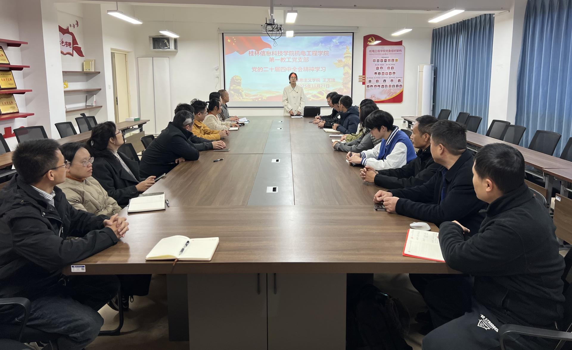 11月21日,机电工程学院第一教工党支部在J706开展以“党的二十届四中全会精神学习”为主题的学习会议。本次学习会特邀马克思主义学院王芳琦老师主讲,围绕党的二十届四中全会内涵、习近平总书记重视“十五五”规划编制的深层原因等核心问题展开深入解读,引导高校党员教师将会议精神融入教学科研与育人实践。