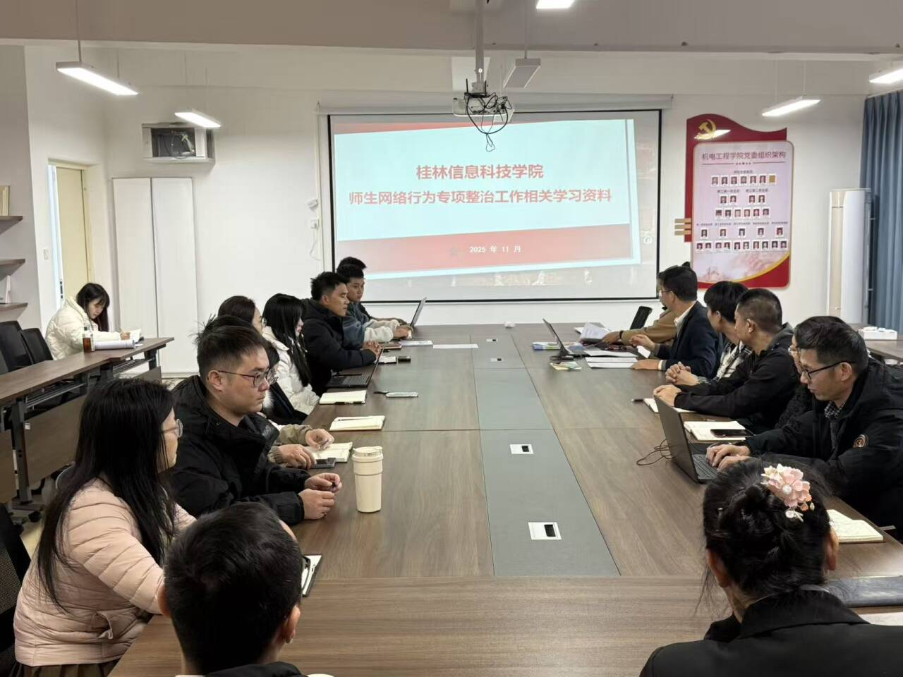 为加强师生网络安全教育,规范网络行为,筑牢校园网络安全防线,11月20日,机电工程学院第二教工党支部在J706召开教职工网络安全教育专题学习会。会议由刘朝福同志主持,旨在落实全校网络安全工作部署,强化教职工网络安全意识与责任担当,明确网络行为底线。