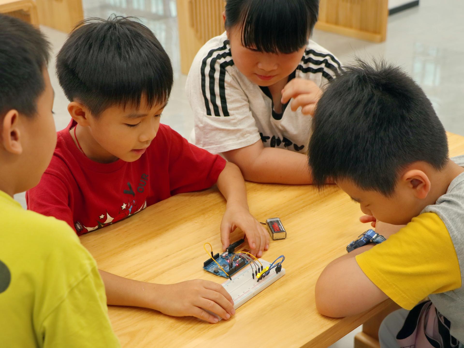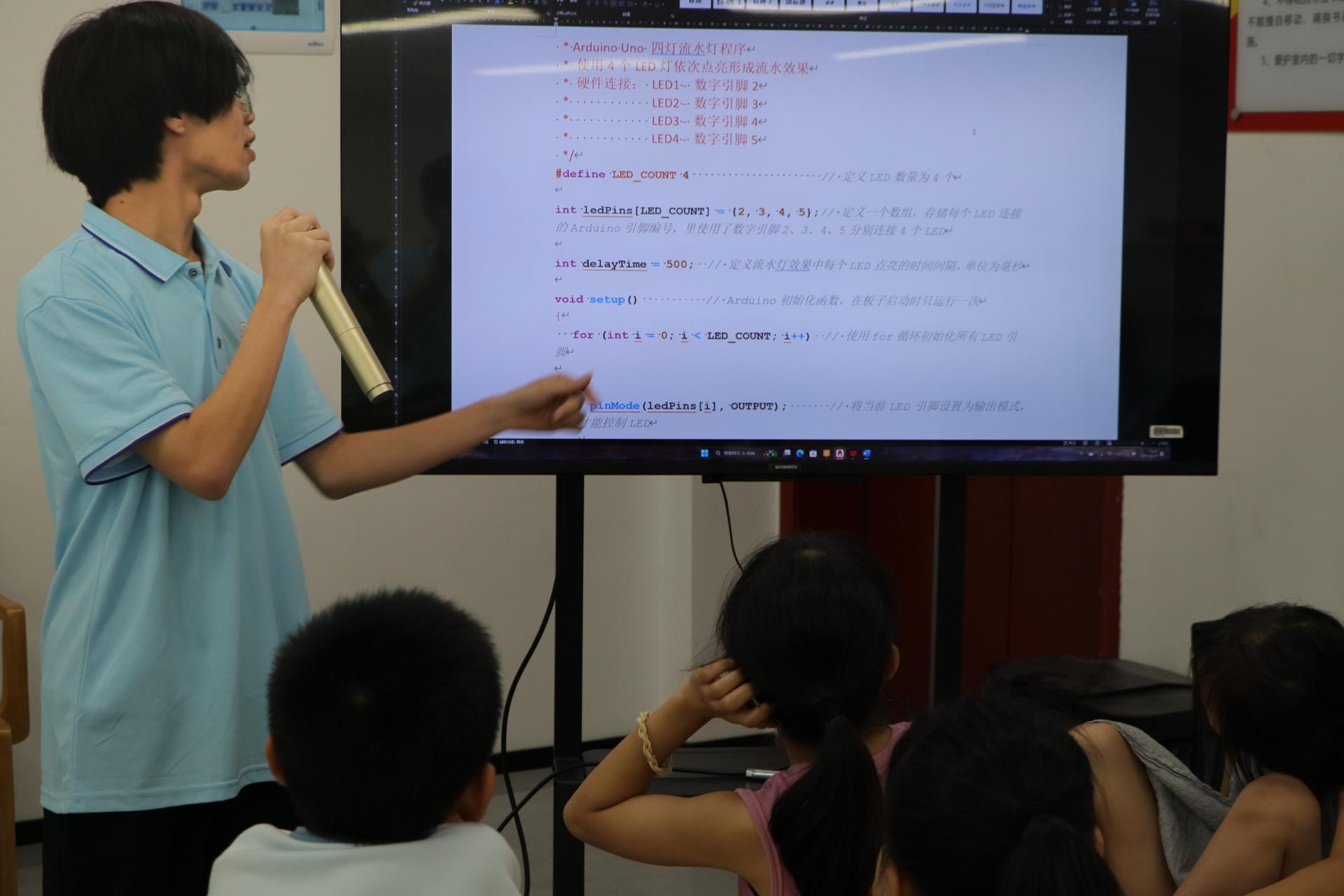 在Arduino课程中,小朋友们在团队成员的耐心指导下,利用Uno微控板和简单代码制作出流水灯。在项目成员的指导下亲手连接电路,小朋友们亲眼见证灯光按设定程序依次亮起,真切感受编程魅力与科技神奇,激发对电子编程的好奇心与探索欲。