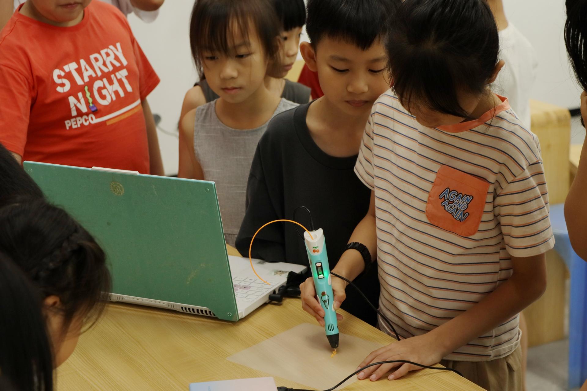 小朋友在指导下使用3D打印笔