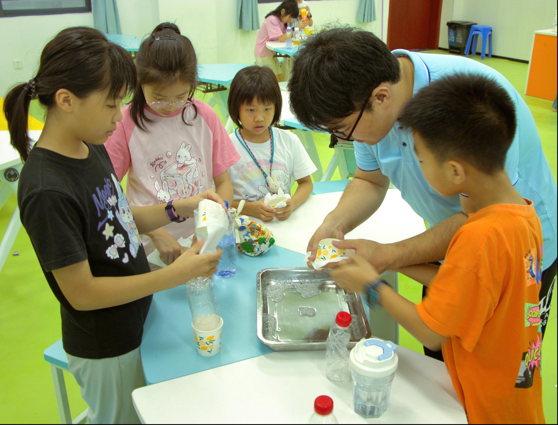 科普实验课程的吹泡泡龙实验将课堂推向高潮。团队成员讲解洗洁精表面活性剂会降低水表面张力形成水膜的原理,展示如何通过湿巾小孔吹出泡泡龙。小朋友们积极参与动手操作,现场充满欢声笑语。这一实验让小朋友们理解科学原理的同时,培养了观察力和动手能力。