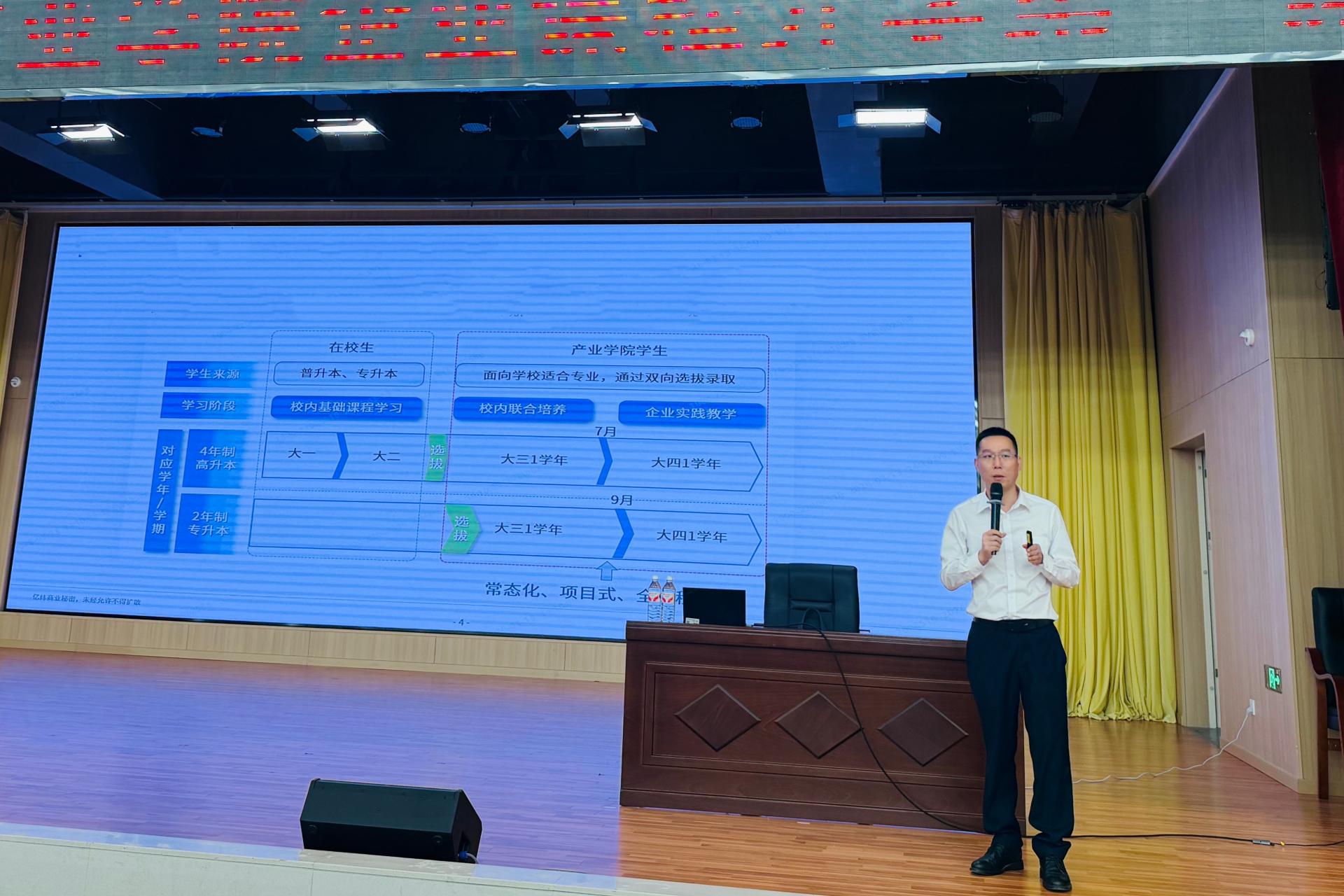 课堂上,梁东来副总监紧扣现代产业学院“产教融合、协同育人”的核心定位,围绕产业学院培养定位、“2.5+0.5+1”创新培养模式、企业实践核心价值、职业发展成长路径四大板块展开细致讲解,深入解读校内联合培养与企业实践教学深度融合的育人逻辑,明确提出“工程能力与职业素养双提升”的核心培养目标。他结合锂电池行业最新制程工艺、职场行为规范、岗位实操技能等实习重点内容,系统拆解各阶段学习任务与能力成长要求,同时详细阐释企业文化认同为基、技术技能为要、长板发展为核的三维用人标准,通过往届产业学院优秀毕业生的真实成长案例,激励同学们树立正确职业观,脚踏实地锤炼专业本领。此外,他还全面介绍了企业技术、管理、职能三大职业发展通道与多元晋升机会,明确实习前需要掌握的核心技能储备要求,为学子们科学规划个人成长路径提供了精准、务实的指引。