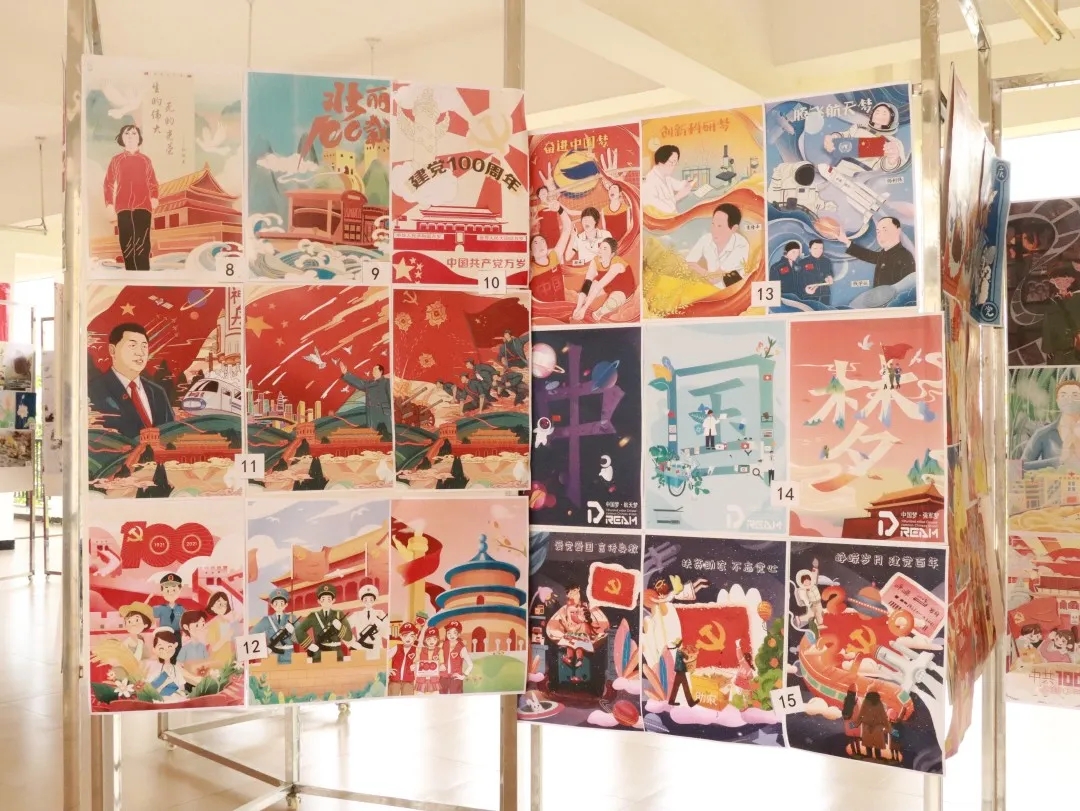 为庆祝建党100周年,抒发广大师生的爱国情感,由党群事务部主办,设计系党总支承办的“感党恩 跟党走”党史学习教育暨庆祝中国共产党成立100周年美术书法摄影作品展于近日在四教二区二楼平台展开。