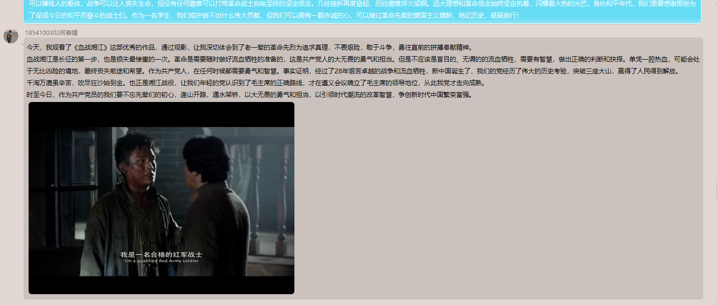 为贯彻落实党史主题教育要求,不断增强大学生爱国情怀,培育和践行社会主义核心价值观。6月21日,由管理系党总支主办、第三学生党支部承办的《血战湘江》观影活动于线上开展。