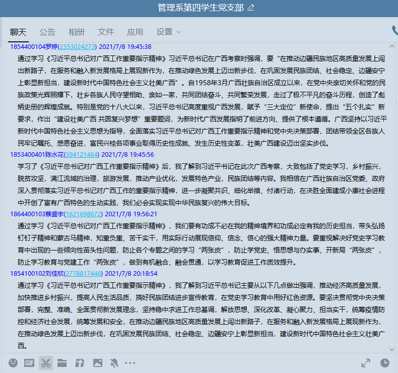 为深入学习贯彻习近平总书记在广西考察期间重要讲话精神,结合当下党史学习教育,7月8日由商学院党总支主办,第四学生党支部承办的《习近平总书记对广西工作重要指示精神》专题学习于线上开展,本次会议由商学院第四学生党支部书记徐冉老师主持,全体师生党员参加。
