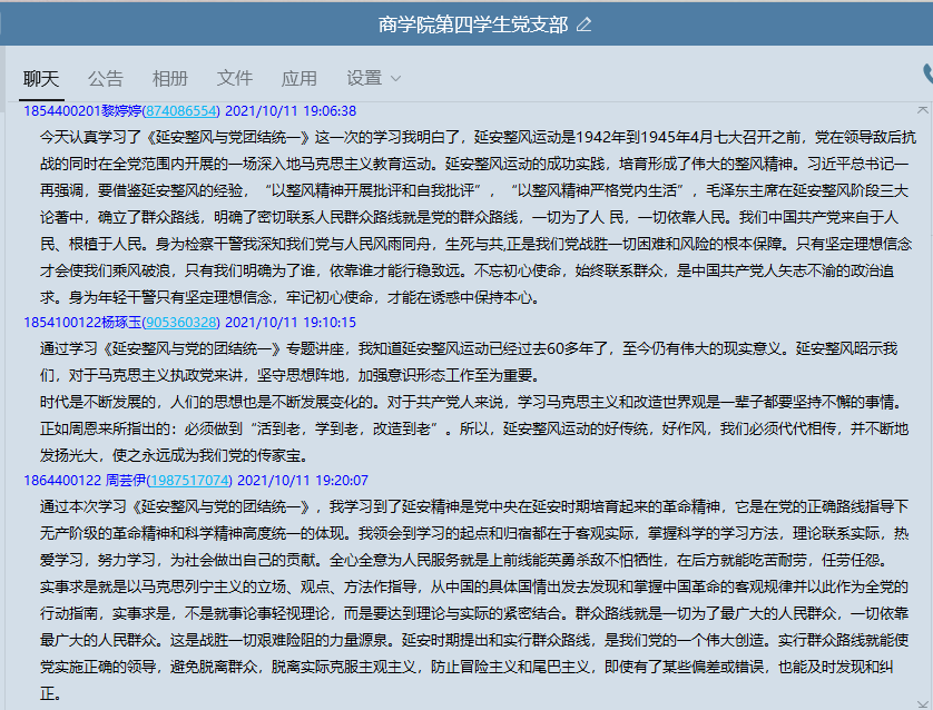 为推动党史学习教育走深走实,引导党员干部传承红色基因,发扬艰苦奋斗的优良作风,10月12日,由商学院党总支主办,第四学生党支部承办的《延安整风与党的团结统一》党史专题学习通过线上线下相结合的方式开展。本次学习由商学院第四学生党支部书记徐冉老师主持,全体师生党员参与。